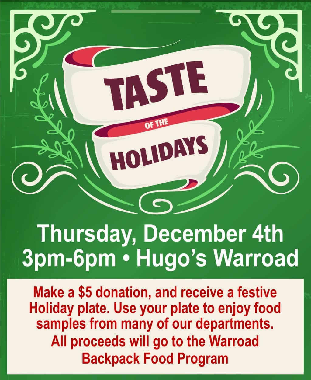 Bring your festive spirit and come join the crew at Hugo’s Family Marketplace.  Make a $5 donation and receive a plate.  Use your plate to sample through each department of tasty treasures for the Holidays.  All proceeds help the Warroad Backpack Food Program.